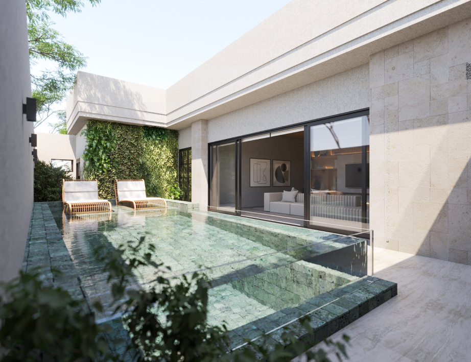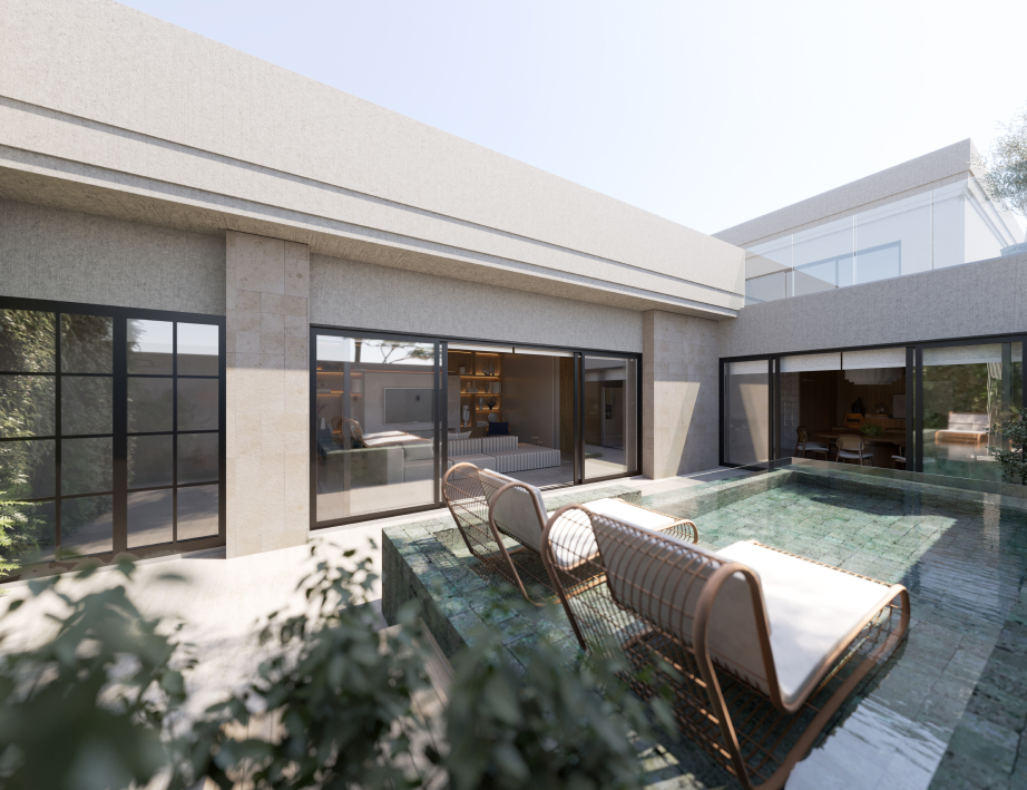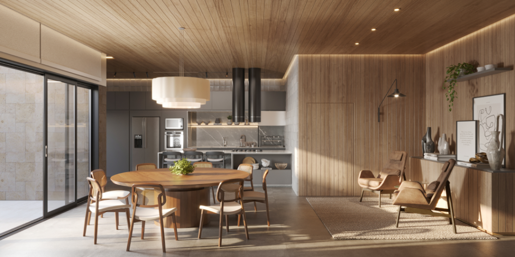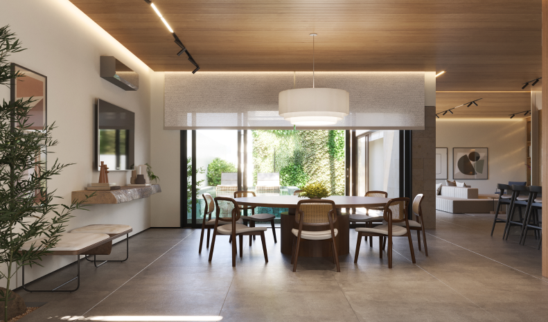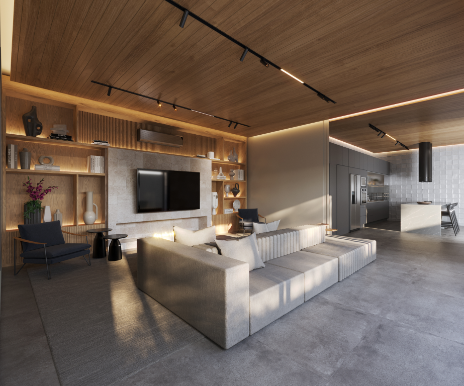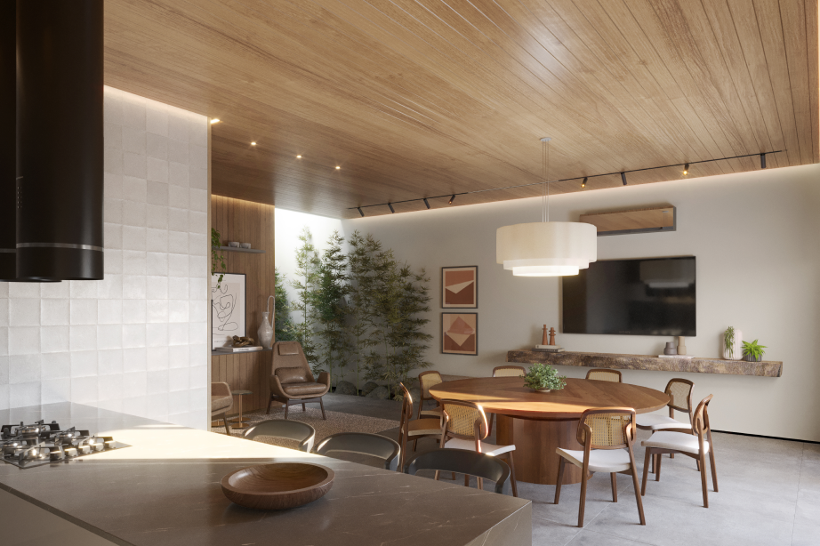 Ao chegar no living, somos imediatamente envolvidos por uma sensação de amplitude e harmonia, que assim como o restante da área social convidam ao relaxamento e à convivência. Da pequena área de estar é possível admirar as grandes portas de vidro que revelam a vista da piscina. A cozinha, situada estrategicamente entre a sala de jantar/estar e a sala de TV, foi projetada para ser um convite à socialização e à culinária. Onde uma grande península de pedra proporciona um espaço generoso para preparação de alimentos, enquanto a marcenaria desenhada oferece armazenamento discreto e eficiente para os utensílios e os eletrodomésticos.