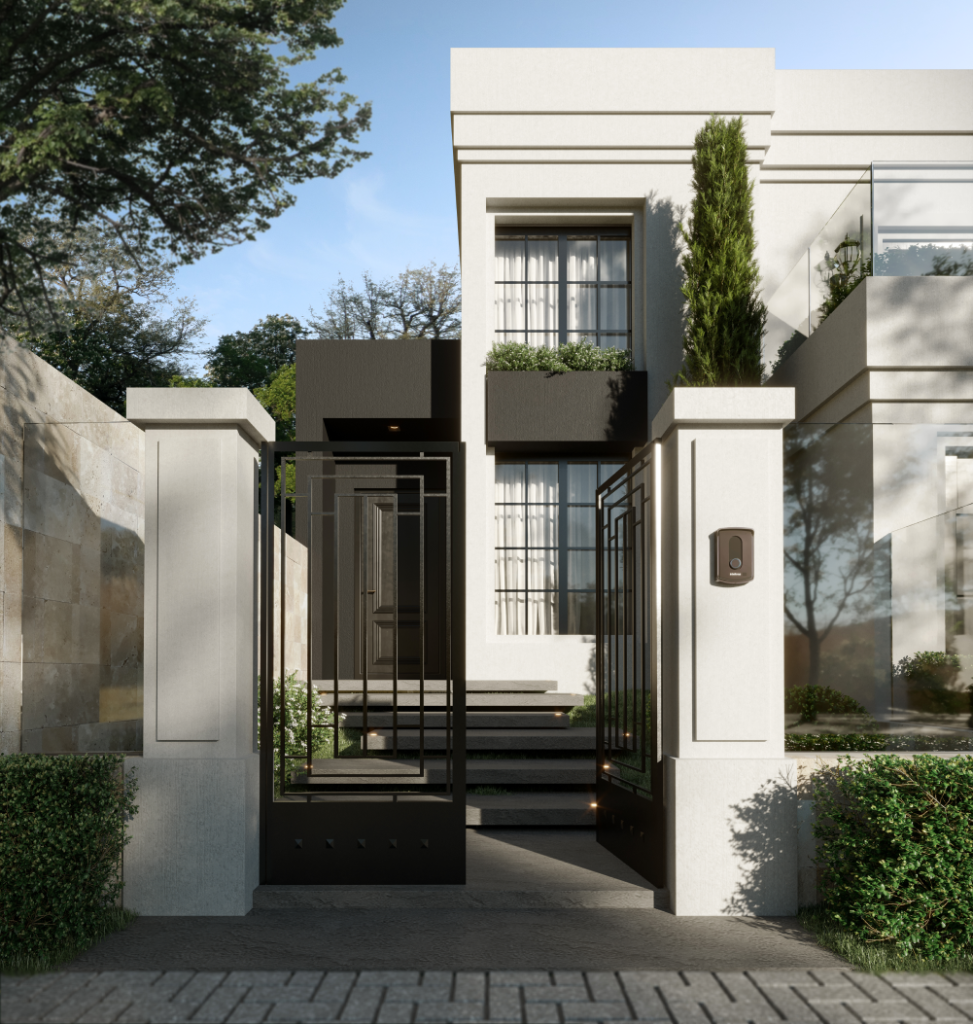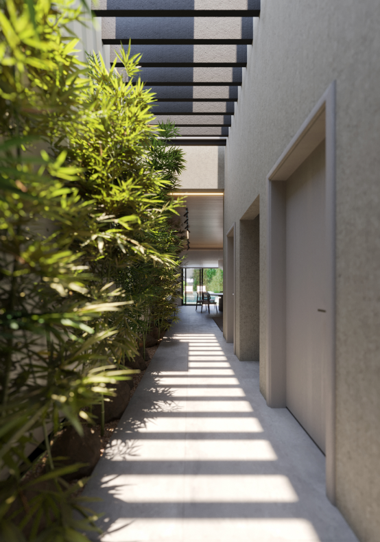 Ao entrarmos no hall, pensamos em um caminho que começasse a introduzir a decoração contemporânea de forma suave, respeitando a linearidade e a simetria do estilo neoclássico. Nasceram então, pérgolas que ecoam, criam efeitos de luz e sombra, e permitem a entrada de luz natural para alimentar a vegetação que recebe quem entra na casa.