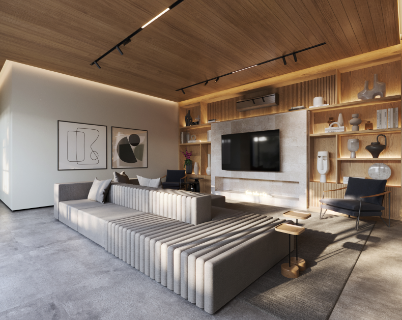 Ao chegar na sala de TV, que pode ser integrada a cozinha através de uma grande porta em marcenaria, seguimos com a sensação de conexão entre o ambiente externo e interno, repetindo as grandes portas que levam a área da piscina. No centro da sala, o aconchegante sofá ilha convida ao relaxamento, oferecendo bastante espaço para acomodar os moradores e convidados, que podem assistir TV tranquilamente já que ela foi estrategicamente posicionada, criando um ponto focal para entretenimento e lazer no centro da residência.