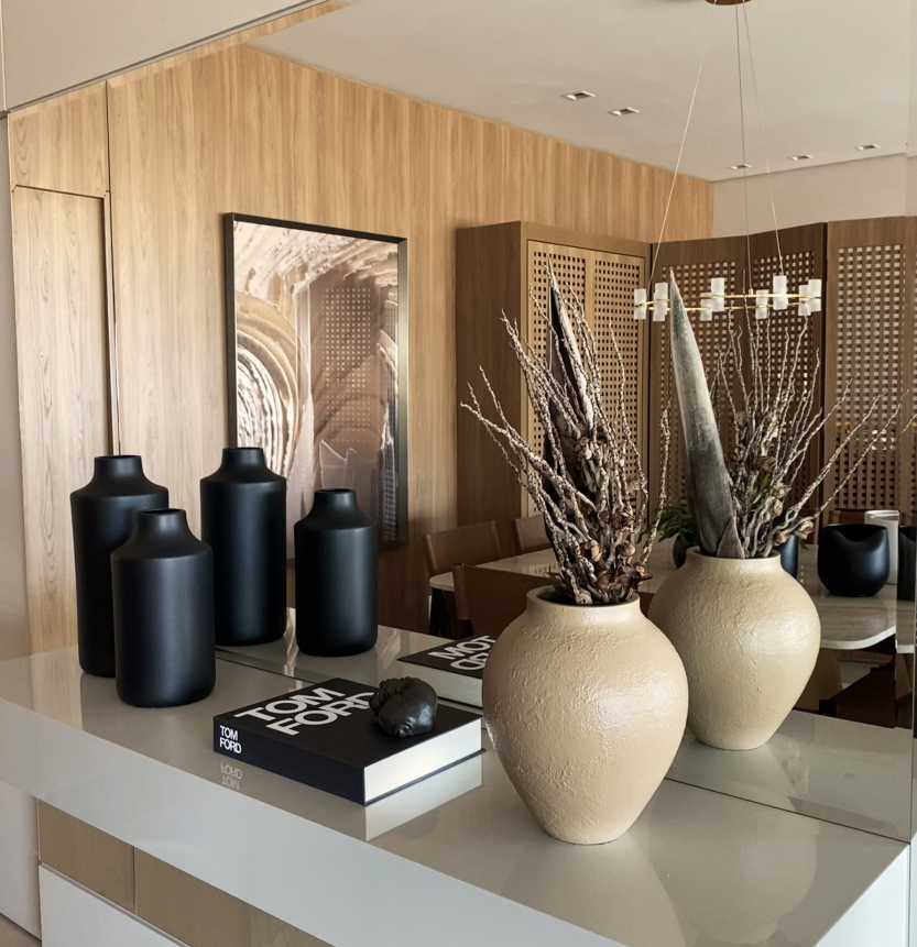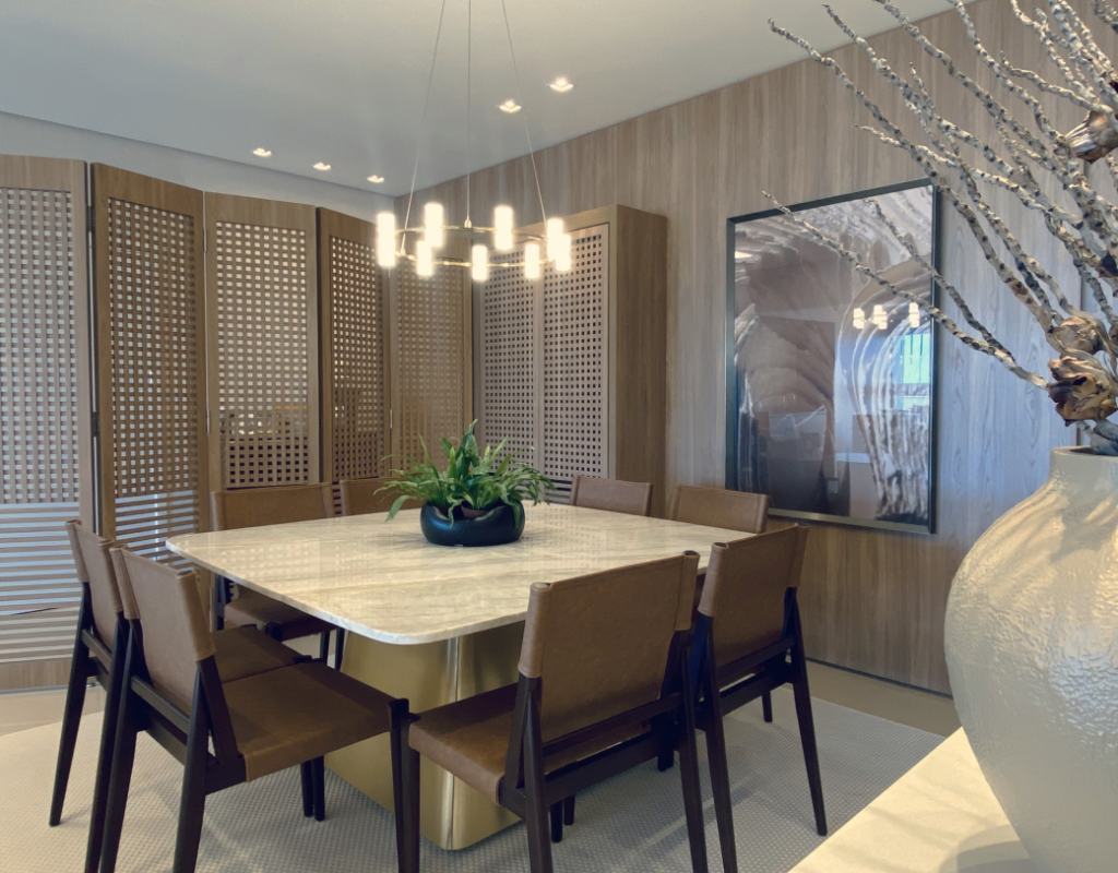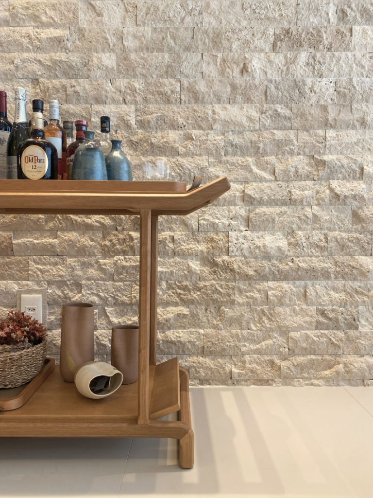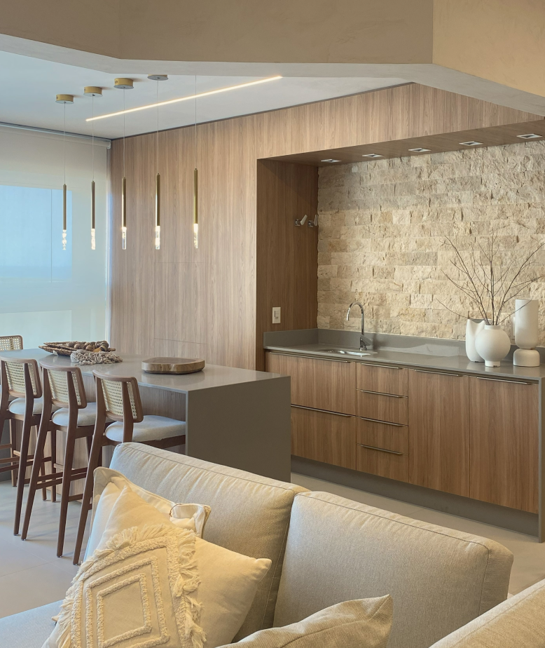 Logo, para tudo isso fazer sentido e ainda assim trazer sua personalidade para o novo lar, trabalhamos com materiais clássicos, assim como pedras naturais e metal dourado, combinados com linhas mais retas e leves.