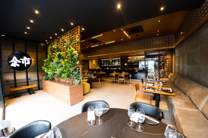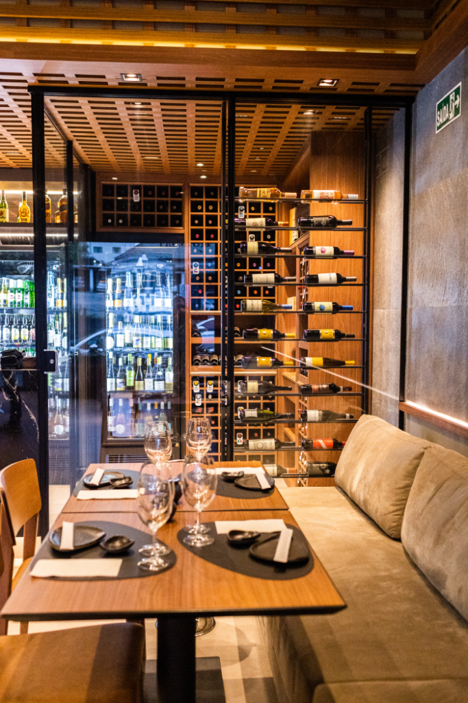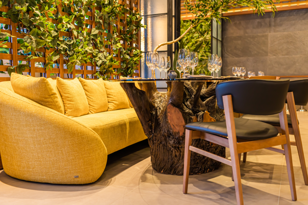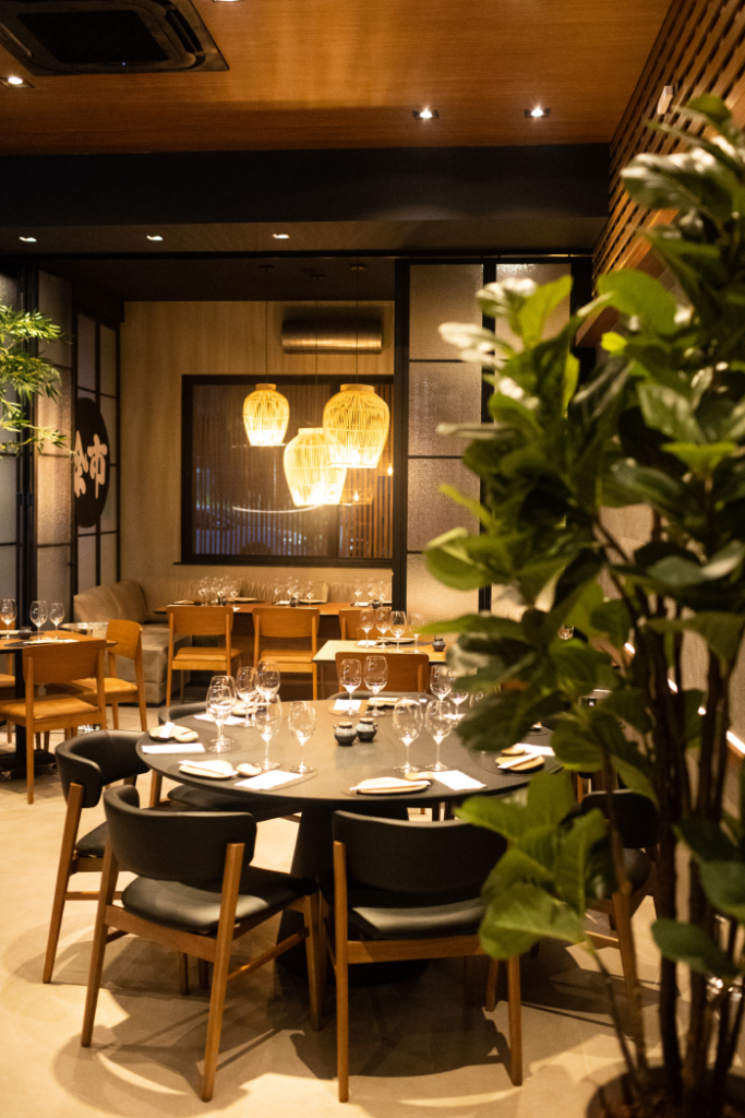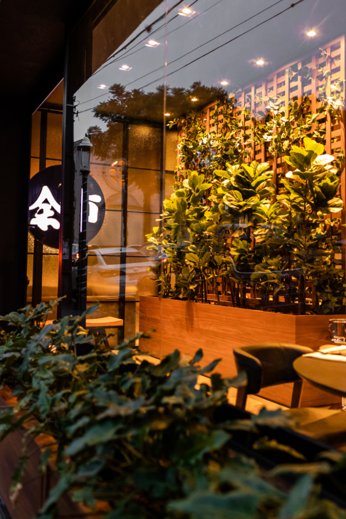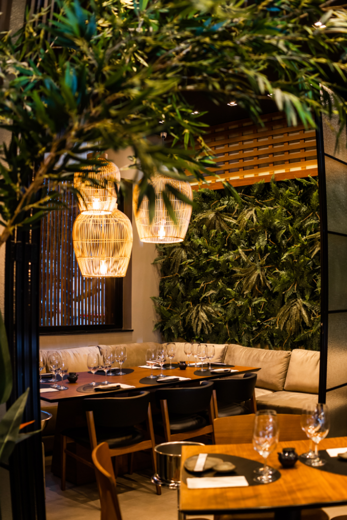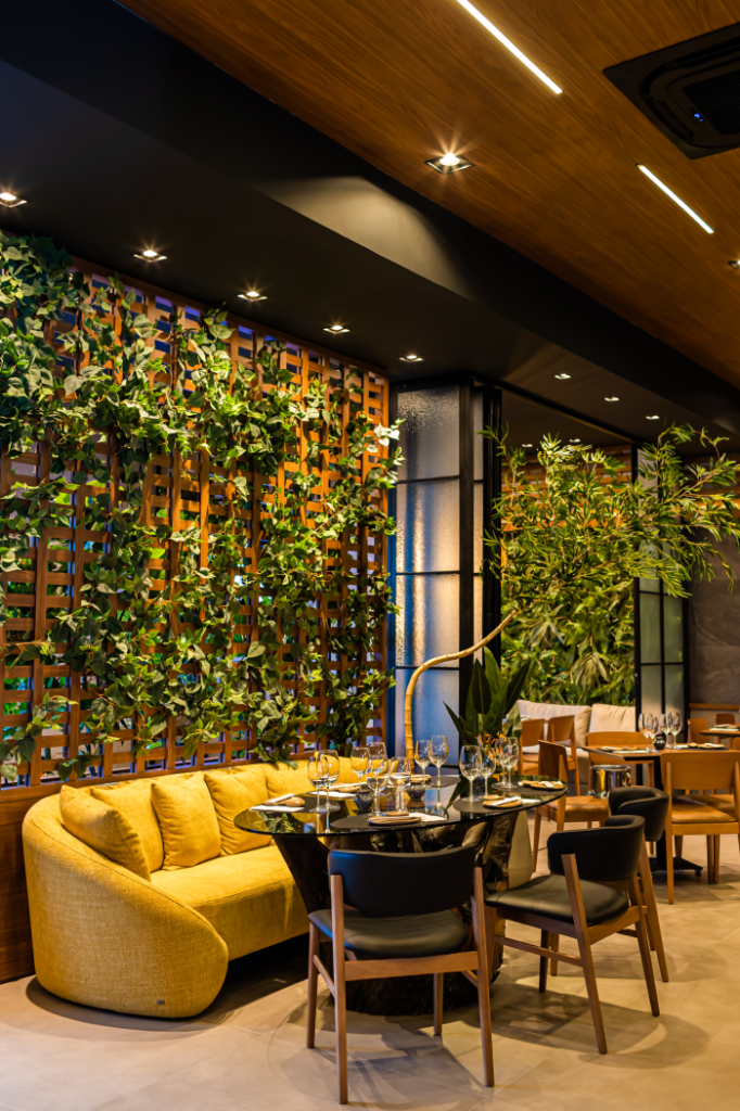O brilho das luzes e o mostarda do sofá acompanhados da vegetação foram escolhidos para criar uma mistura harmoniosa de calor e charme orgânico que expressam felicidade e dão um toque de tranquilidade ao ambiente movimentado. Tudo isso desenhado para estar em equilíbrio com a repetição do elemento vazado no roda teto e nos forros do bar e da adega, refletindo novamente a disciplina dos japoneses.