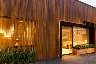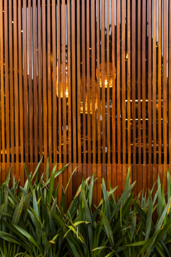 O painel ripado da fachada foi desenhado para ter forma e função. Ao mesmo tempo em que oculta a antiga fachada do imóvel, faz um match entre a cultura japonesa, retratando sua linearidade e constância através da repetição das ripas, e a cultura regional, por meio da madeira natural em tom avermelhado.