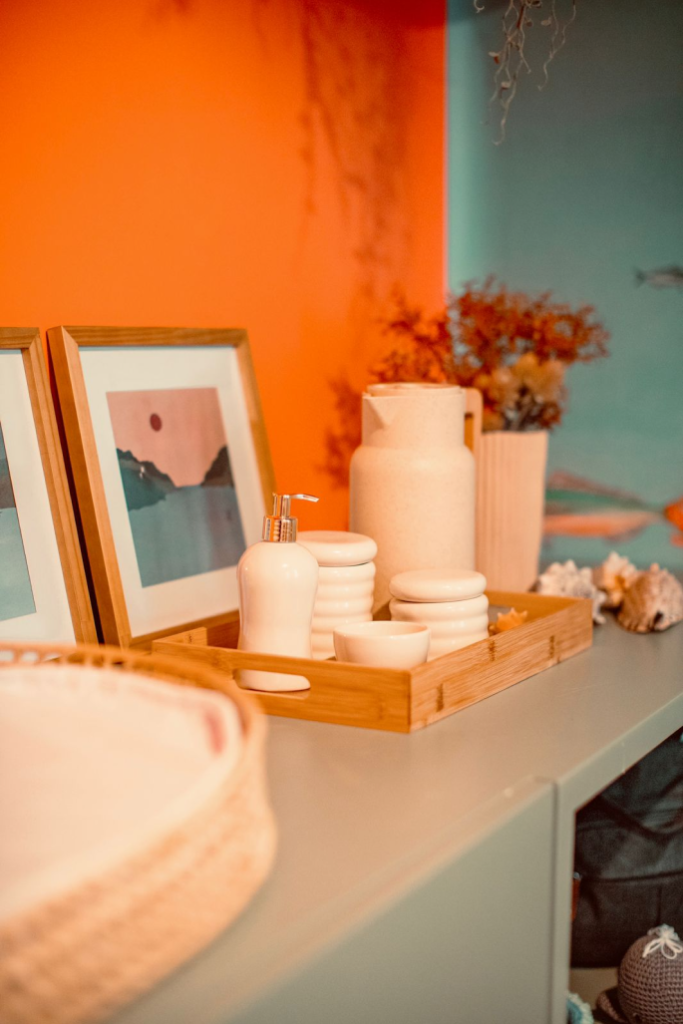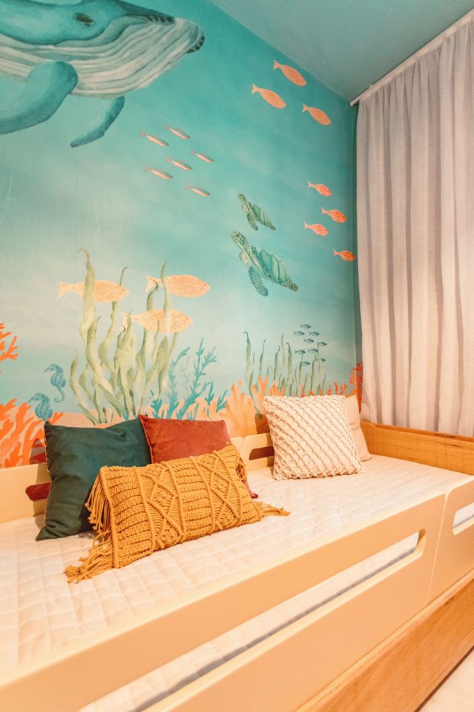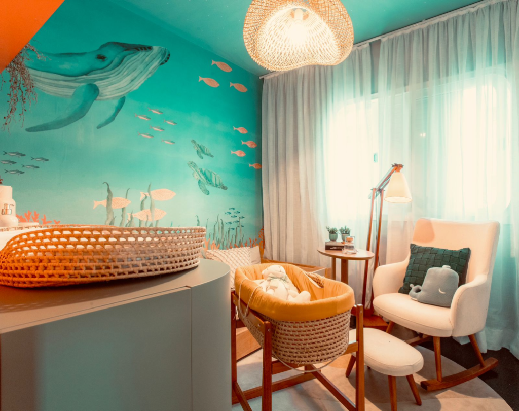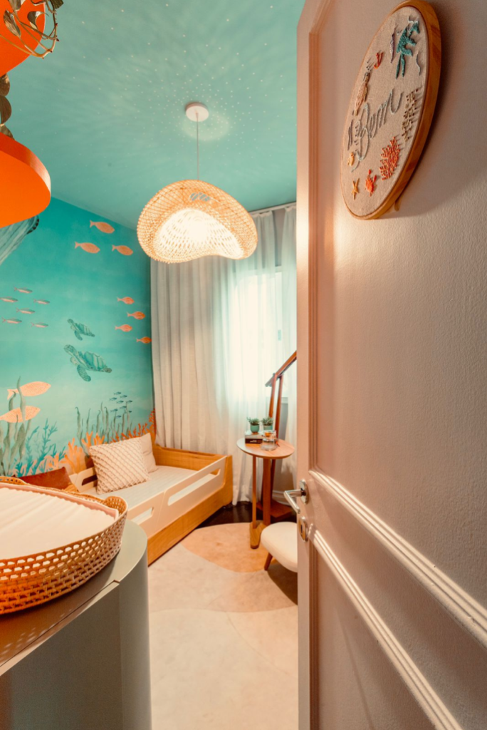 Nascem uma vida e um oceano. Pensando em um ambiente seguro, onde a criatividade e a individualidade podem florescer, trazemos a arte por meio do papel de parede assim como a natureza pelas curvas da marcenaria, do tapete e dos materiais. Como registro da intensidade do casal que deu vida ao peixinho que habita esse oceano, cores alegres e vibrantes entram para alegrar a decoração.